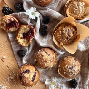 - Wash and dry blueberries. Add 2-3 tablespoon flour to the blueberries and stir gently, making sure all the berries are coated. Add the blueberries to the batter, folding them in gently so they stay intact.