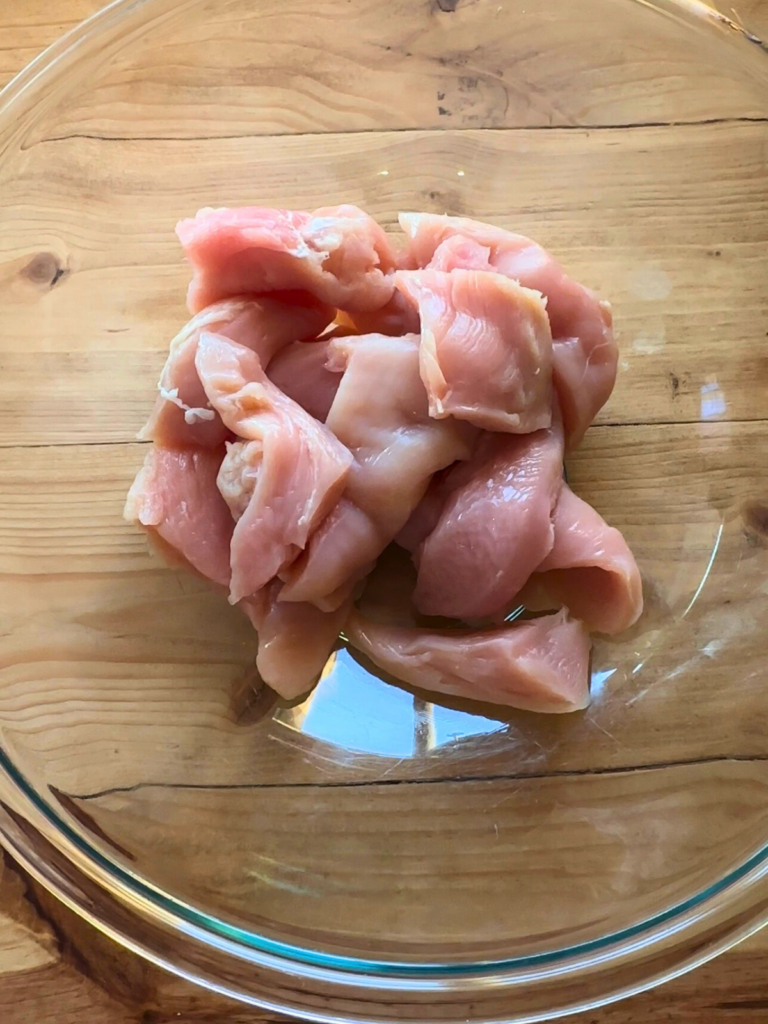 - Prep the Chicken: Trim any fat off of the chicken, and then slice each breast in half lengthwise to make a thinner chicken breast. I like to then cut each breast in half again.